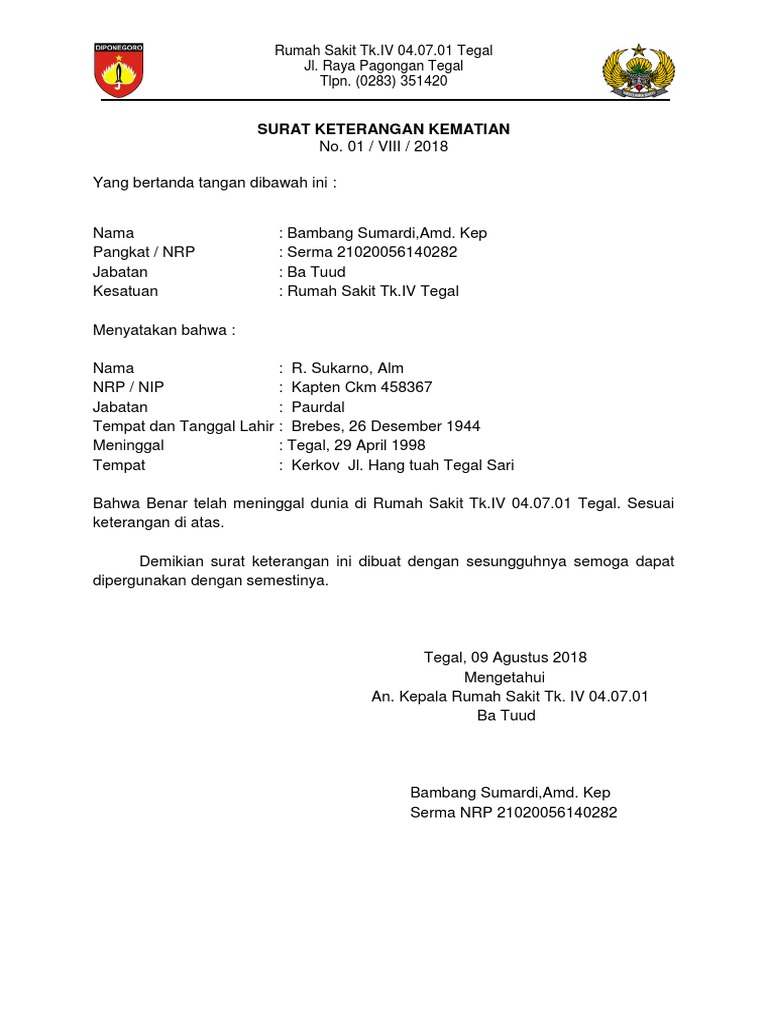 Sutomo surabaya,sebelum sampai ke rumah sakit yang dituju pasien dinyatakan meninggal. Surat ini biasa menjadi salah satu syarat lampiran untuk mengajukan pencairan dana asuransi jiwa atau hal lainnya. Format surat keterangan kematian pada umumnya berisi nama, tempat tanggal lahir, umur. Yang bertanda tangan dibawah ini : Surat keterangan kematian dari rumah sakit, puskesmas, atau visum dokter asli dan fotokopi kk dan ktp bagi pemegang itap cara mengurus surat kematian jika almarhum meninggal di rumah sakit cukup sederhana dan.